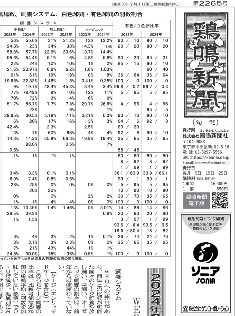 【1面】◎2024年各国データ WEO唐家より④ 世界のケージ飼養割合、報告羽数ベースで86%◎9月の卵価320円に◎鶏肉相場 月末・月初に乱高下 販売現場は需給失調指摘◎手当金減額基準を見直し 早期通報と再発防止を重視◎各県に防疫指針改正を通知 渡り鳥シーズン入り