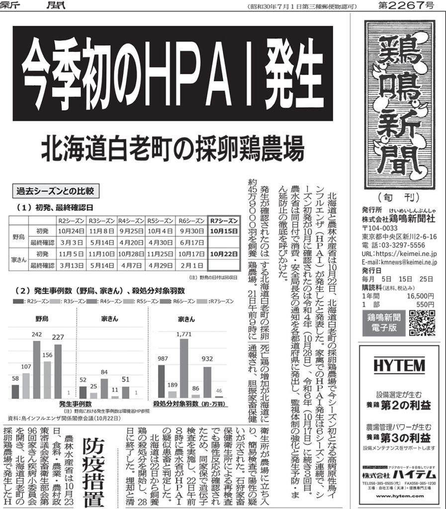 【1面】◎今季初のHPAI発生 北海道白老町の採卵鶏農場◎防疫措置継続と再発防止策強化へ 家きん疾病小委◎農相に鈴木憲和氏◎日本養鶏協会関東甲信越地域協が養鶏大会 千葉のHPAI被害体験伝える 発生防止に向け技術面も共有