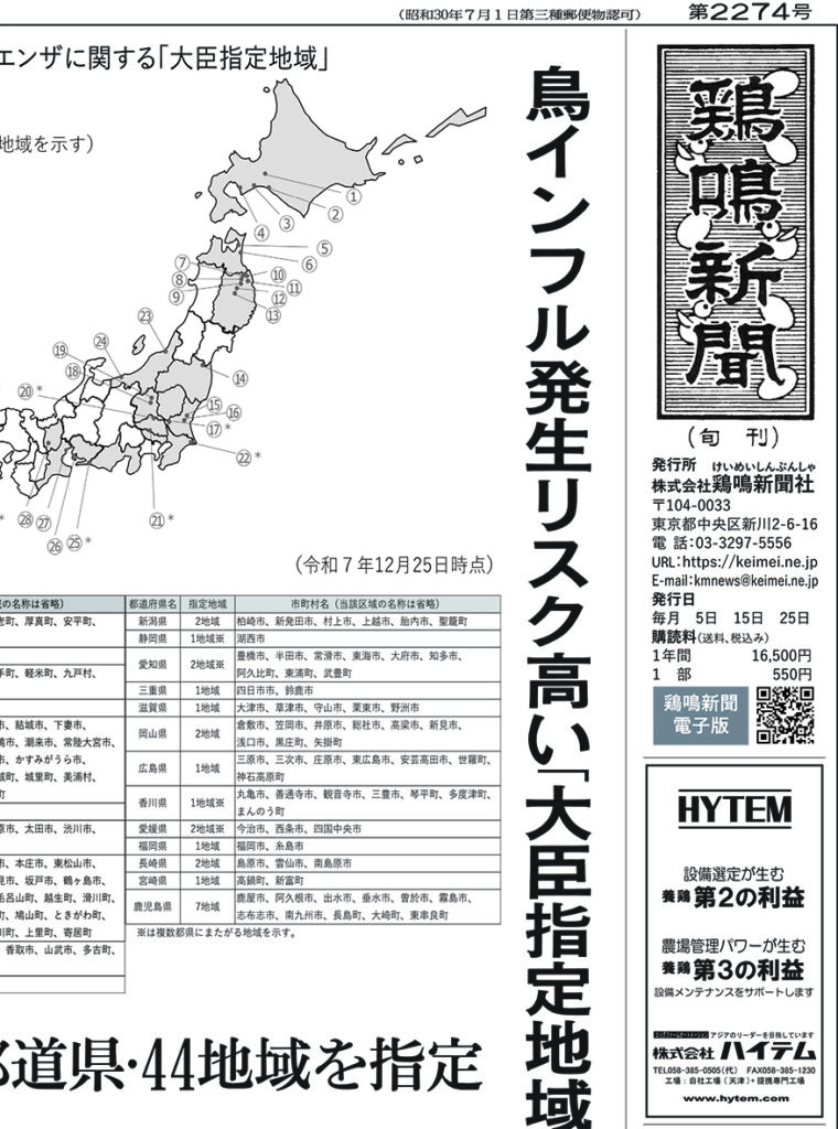 【1面】◎鳥インフル発生リスク高い「大臣指定地域」公表 1月1日から施行 23都道県・44地域を指定◎岐阜県関市、千葉県旭市でもHPAI◎7年度第3四半期、飼料補てん発動なし◎孵卵3日目で卵内雌雄鑑別 非侵襲・AI画像解析で最高精度97% 日立SC・農研機構・九工大が共同開発◎鶏卵相場、需要鈍くもちあい続く