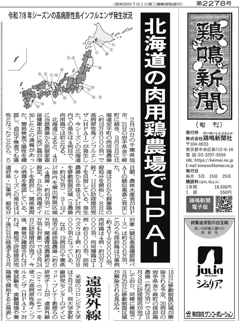 【1面】◎北海道の肉用鶏農場でHPAI◎家禽由来製品の輸出再開 岐阜県など計4県◎遠紫外線によるHPAI対策試験 米コロンビア大学◎令和7年の配合飼料生産量 養鶏用は0.2%減の911万トン 育すう用4.3%増、成鶏用0.5%減、ブロイラー用0.5%減、ウズラ用5.5%減