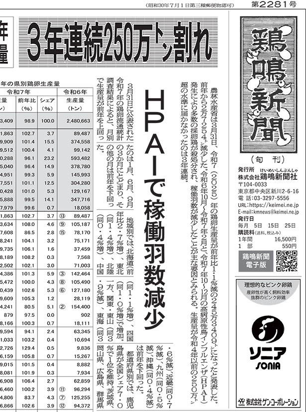 【1面】◎令和7年鶏卵生産量 3年連続250万トン割れ HPAIで稼働羽数減少◎令和8年度の出荷羽数計画0.3%減 日本食鳥協会主要産地協議会 岩手・青森・北海道1.9%減、宮崎前年度並み、鹿児島1.6%増◎燃料油供給の相談窓口設置 農林水産省