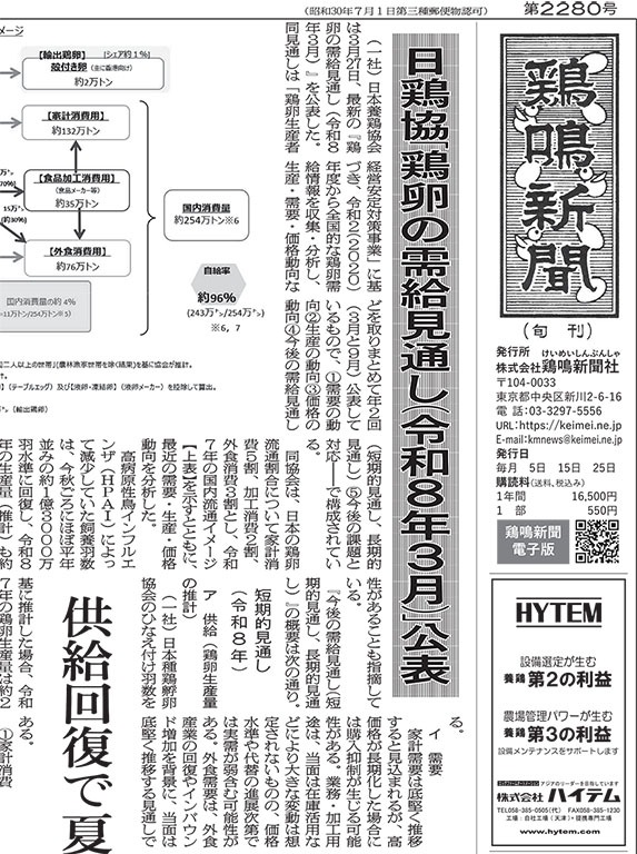 【1面】◎日鶏協「鶏卵の需給見通し(令和8年3月)」公表 供給回復で夏までに価格落ち着く◎配合飼料価格値上げ、2期連続 中東情勢で先行き不透明 全農、トン1,250円上げ◎HPAI 北海道の採卵鶏農場で22例目 宮城県の肉用あひる農場で23例目◎鶏卵、鶏肉とも堅調相場続く